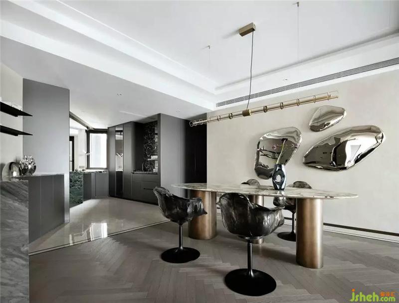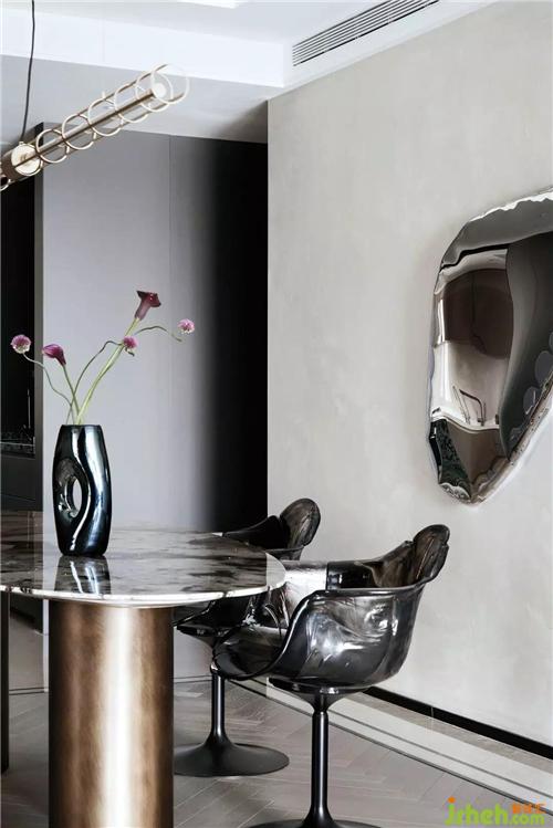 西厨使用了绿色大理石,搭配上银色镜面挂饰;花朵形状一样的餐椅,加上略显华丽的大理石餐桌,这一整个空间犹如一整个艺术品。