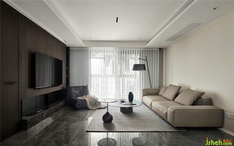 电视背景墙使用了一整块木饰面加上有规律的分缝,与进入主卧的隐形门形成一个整体,同时也留有适当储物的空间;使用了深色的木饰面,沙发背景墙设计师就采用了浅色搭配上少许的石膏线条,简单又不单调。