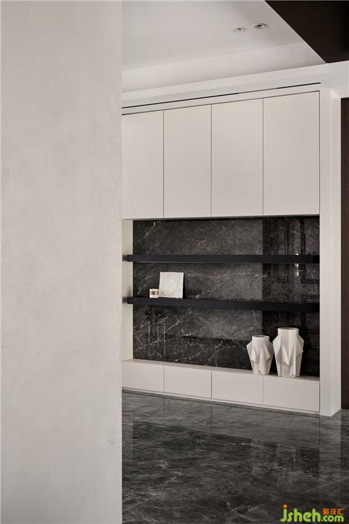 设计师把原始户型一进门的一整面墙做成了玄关柜,背面是主卧的衣柜,很大程度上利用了仅有的空间,力设计客厅大部分的储物空间也都做到了玄关位置。