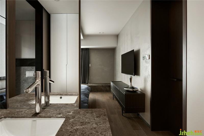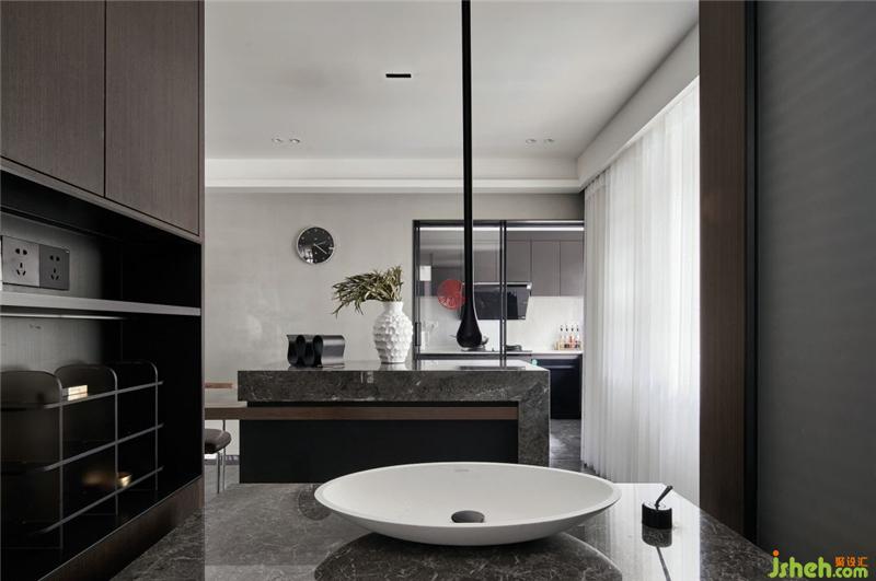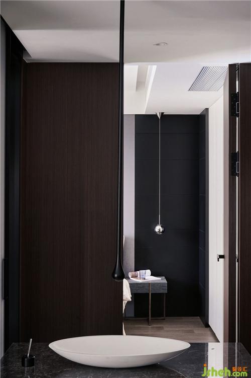 餐厅的点睛之笔便是这个与洗手台连接的这个地方,客卫的空间很局限,设计师则把洗手台移到外面,增加了空间的利用率,力设计选用的水波纹不锈钢以及具有艺术感的龙头,让这个空间更有艺术气息。