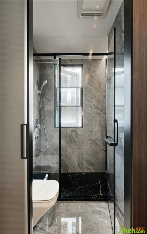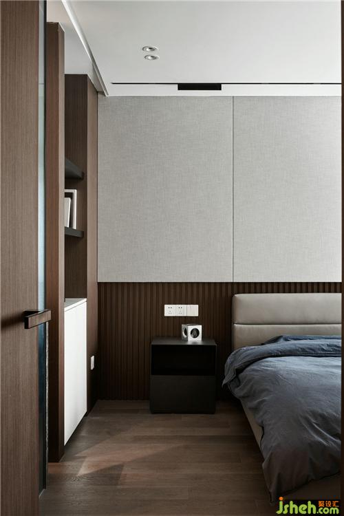 因为原始结构中主卧空间有限,设计师把主卧与玄关部分敲掉增加了储物空间,同时也增加卫生间的空间,把洗手台干区部分移到外面来,使用长虹玻璃作为隔断;主卧吊顶设计成斜面主要是为了避开顶梁位置,给中央空调留出摆放空间,同时考虑吊顶的美观。