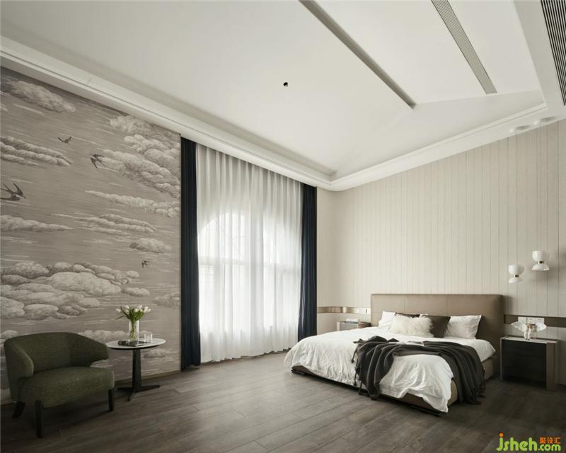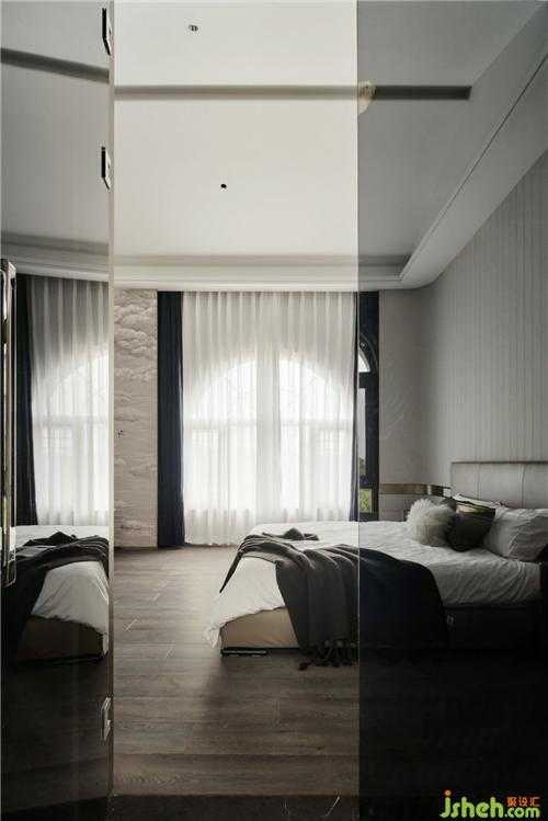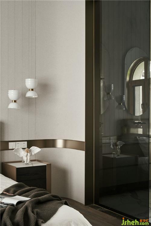三楼整层都是主卧,楼梯前做了一个弧形装饰,杭州别墅装饰房内一整面的镜子使原本就大的房间更加霸气,造型上的简洁反之赋予材质上的奢华。