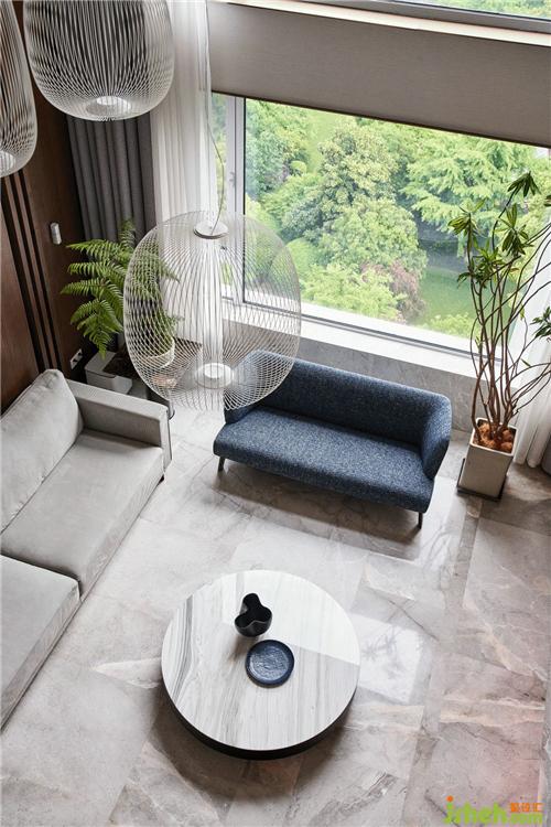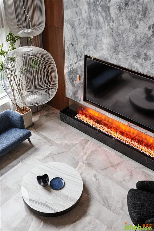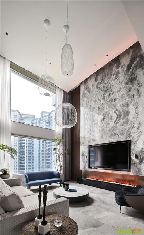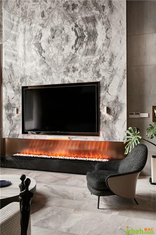 客厅电视背景整面到顶的花纹大理石,动态感十足,视觉效果十分强烈。杭州豪宅设计师将花纹大理石与深色木饰面,两种天然材料搭配组合,室内的时尚轻奢贵族气质油然而生。