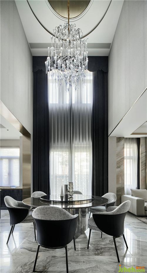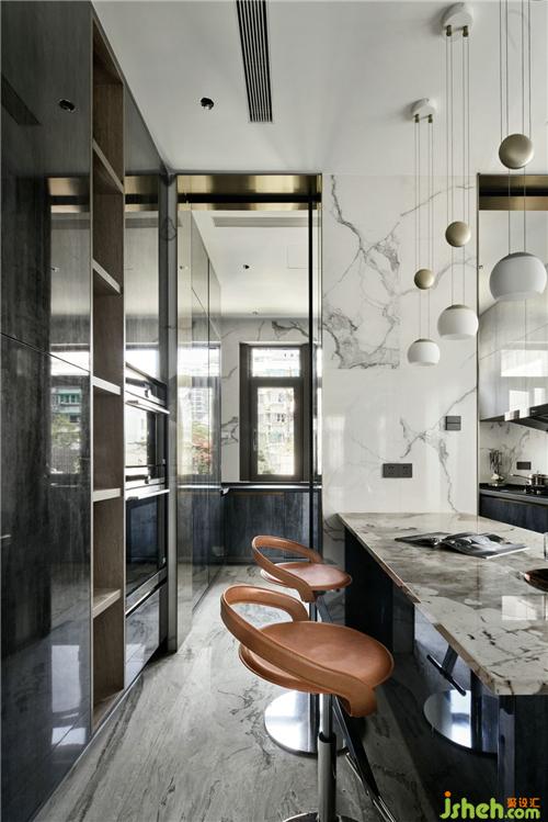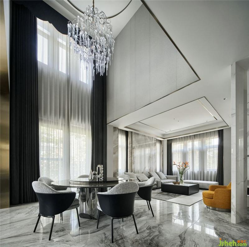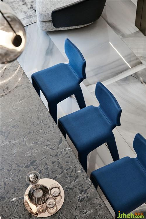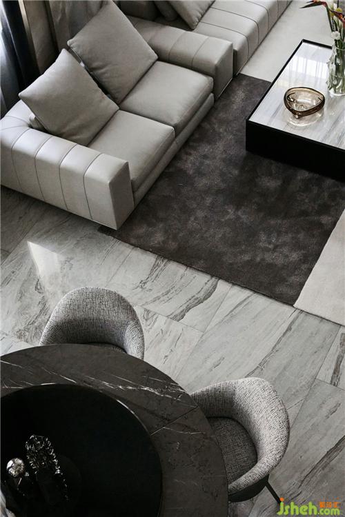 沙发背后是一整面有纹理的大理石,交错设计给予整个空间视觉上的舒适,搭配minotti全屋家具,营造出一种低调高级的奢华与档次感。