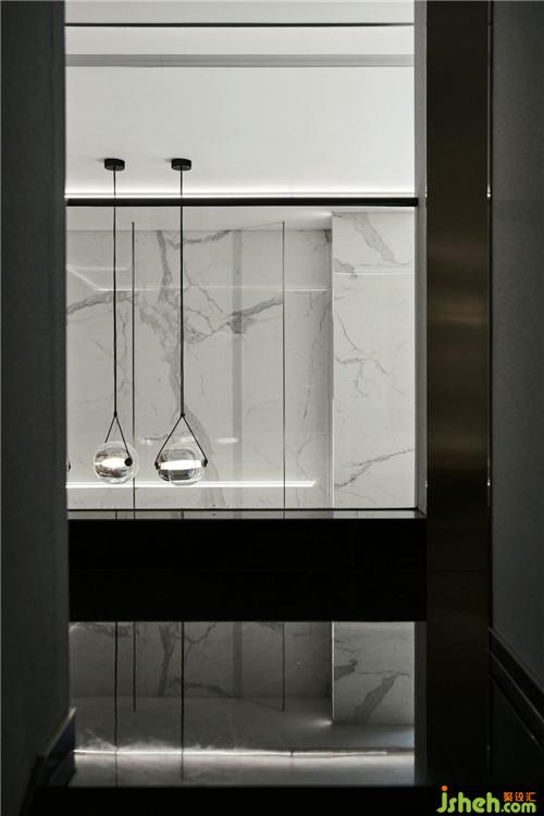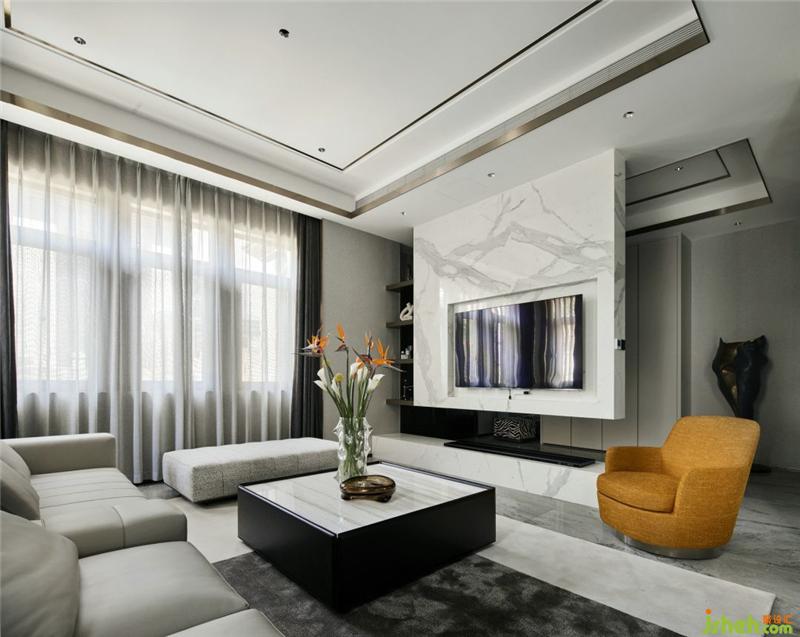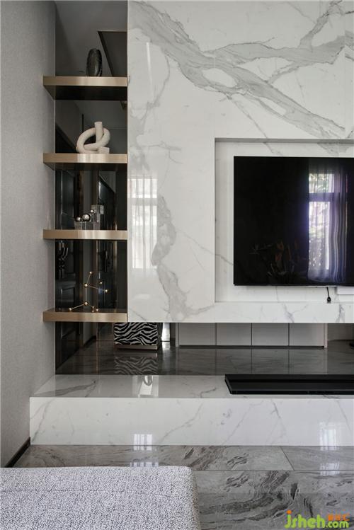 客厅电视背景墙使用白色大理石悬挂,用于分割出玄关与客厅;巧妙运用镂空设计,电视背景墙旁边加入镂空隔板,杭州别墅装饰通过隔板望去是玄关入户到顶的镜子,设计线条十分流畅,空间划分明确;
