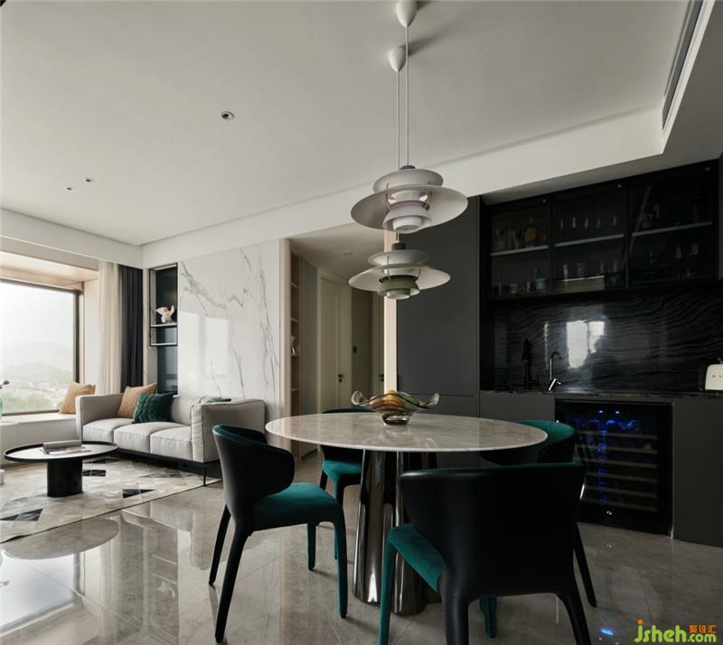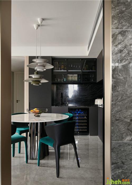 餐厅与客厅处于同一空间,两者之前的联系密不可分,沙发背景使用了白色大理石,则餐厅制作纯黑的橱柜。杭州装修设计麻雀虽小五脏俱全,根据业主需求,红酒柜、水吧台、展示柜等都保留好位置。