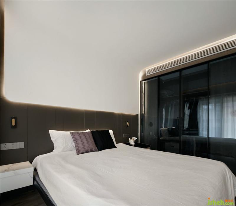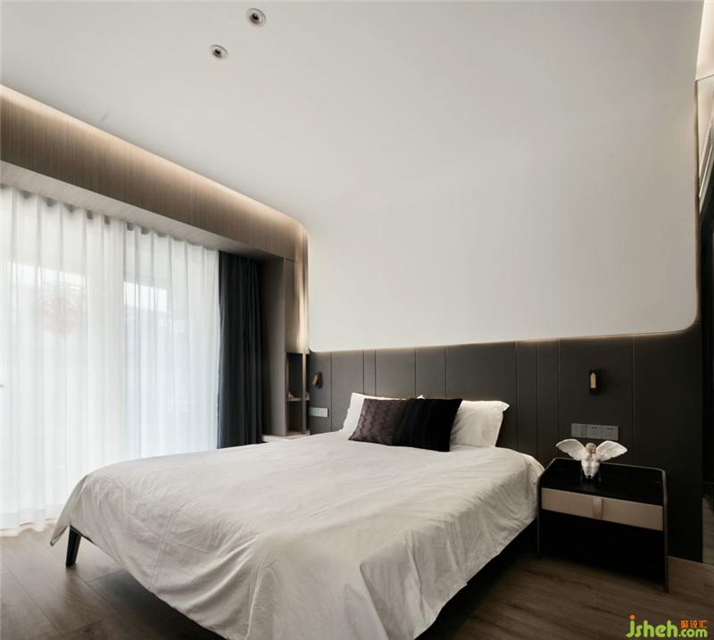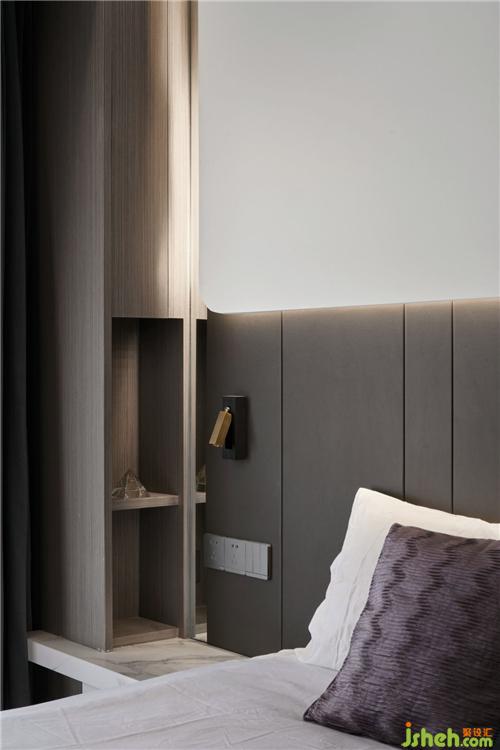 主卧吊顶抛开了常规做法,做了一个异形延伸到墙面,成为了整个屋子的亮点。设计师根据原始户型为主卧留出一个衣帽间的位置,衣帽间墙体另一侧作为走廊上的储物空间,物尽其用便是如此吧。