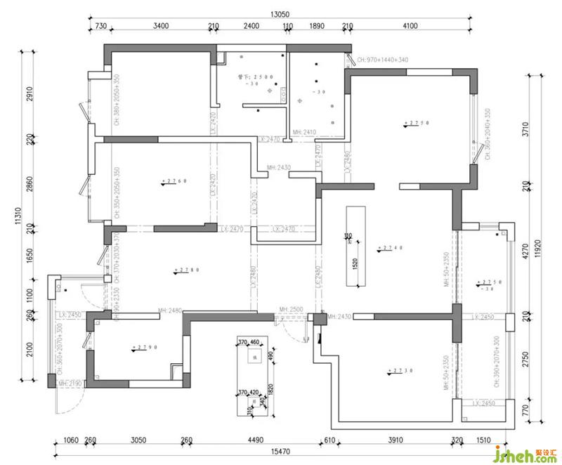 原始结构空间动线比较凌乱,浪费面积比较多,入户的玄关设置也会有点局促,不是满足三代人同住的理想空间。