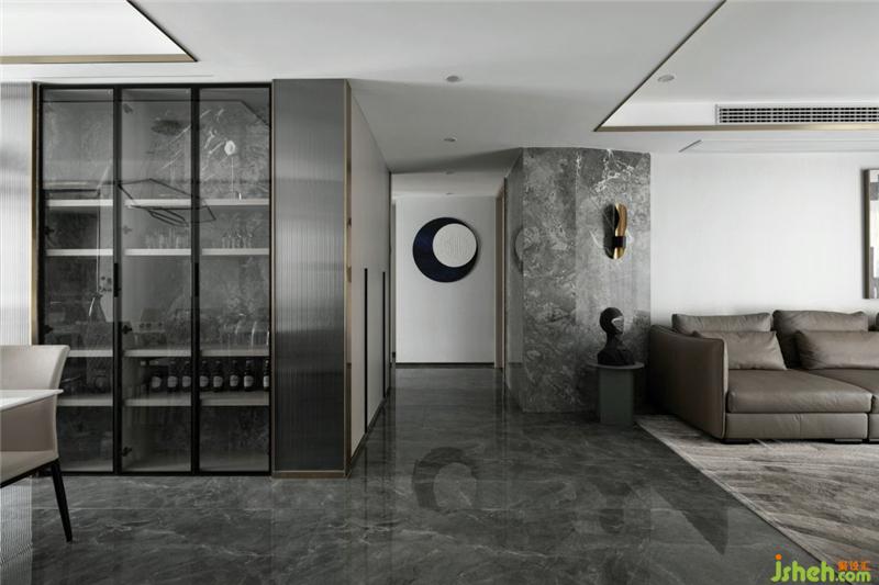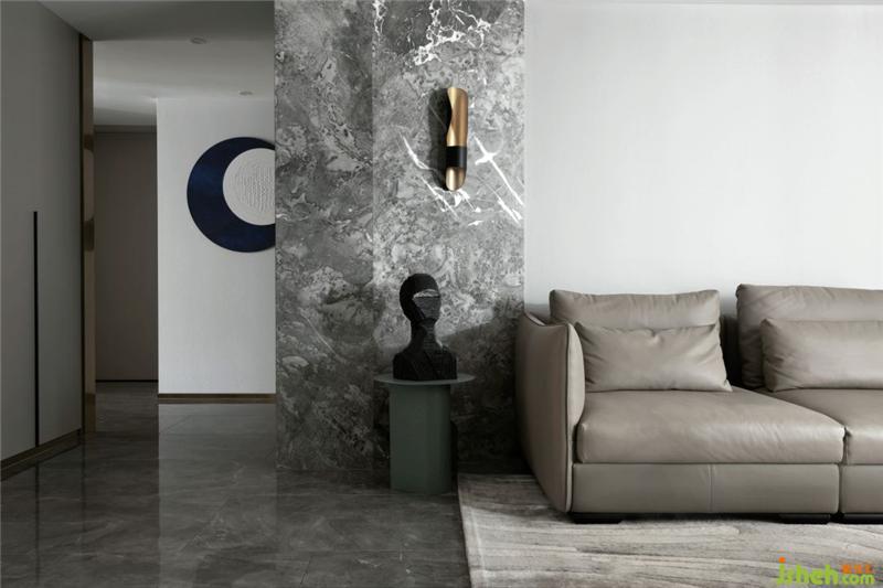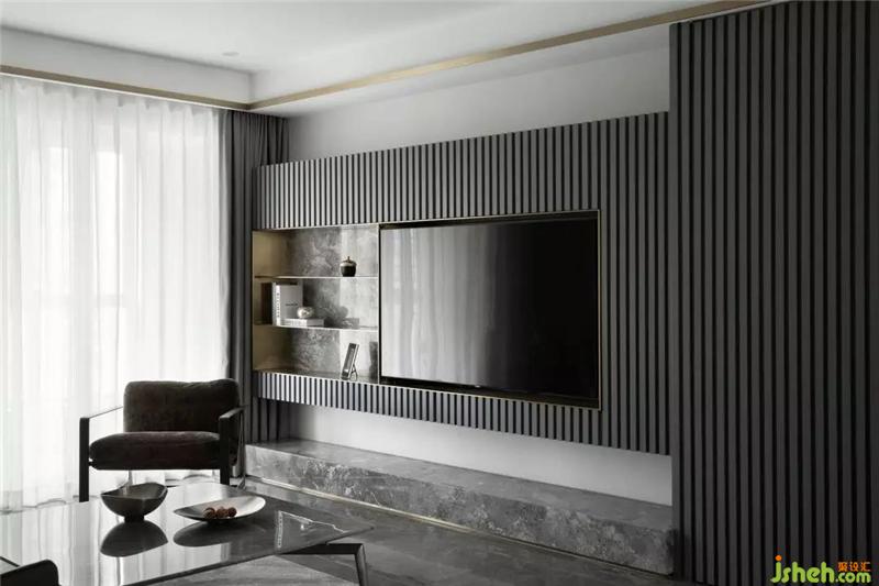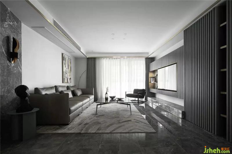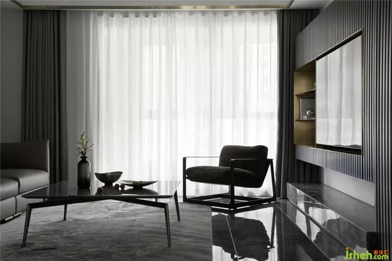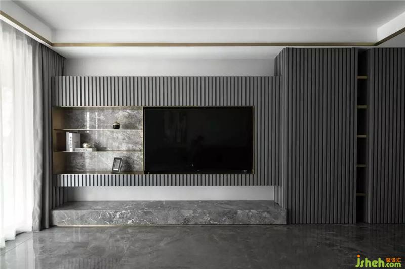 全空间以灰白色调为主,电视墙隐形柜门的格栅线条,满足功能同时丰富了空间的层次感;沙发背后灰纹路的大理石装饰和金属板的运用,杭州装修设计营造出一种有机的现代奢华感,用线条勾勒出一个干净简单的画面。