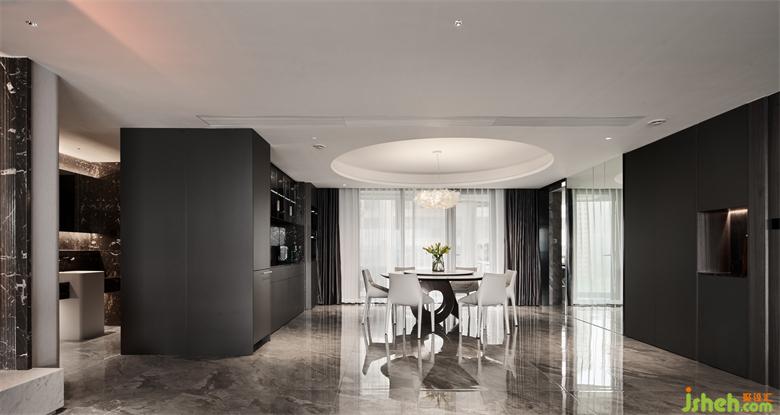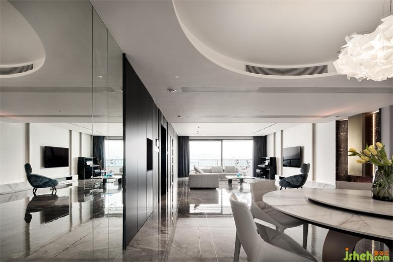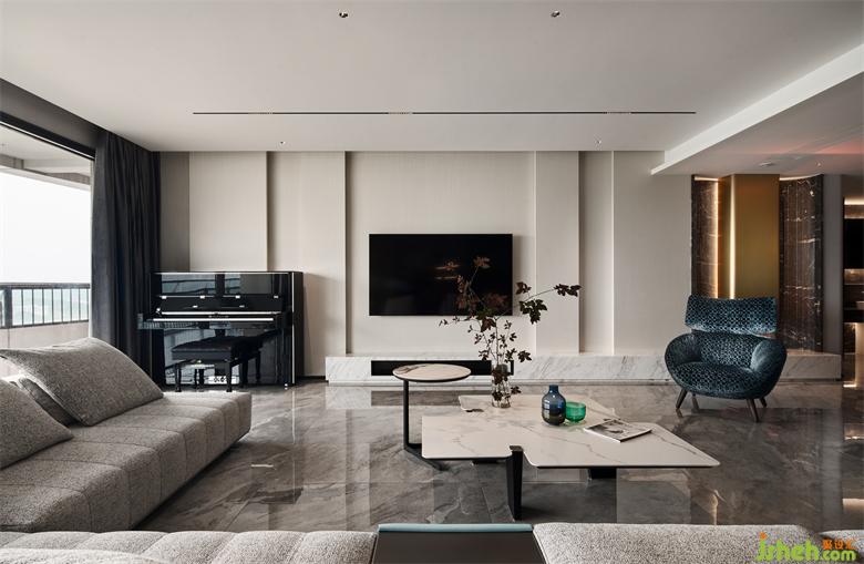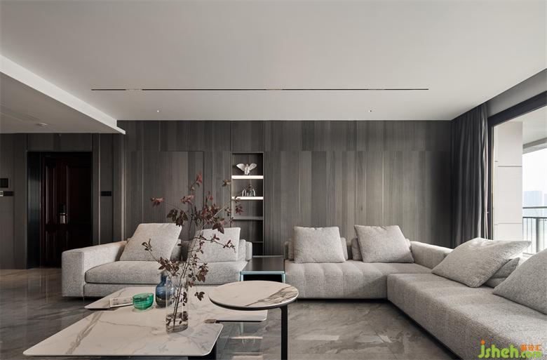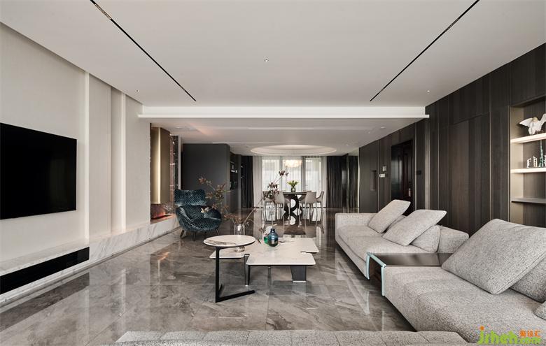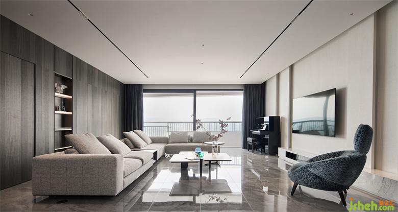 嵊州家居设计米灰色系的沙发与灰色大理石地板相呼应,阳光透过落地窗,将温暖带了进来,白色的电视背景墙与灰黑色的墙面相照应,相互突出,又相互融合,张弛有度。