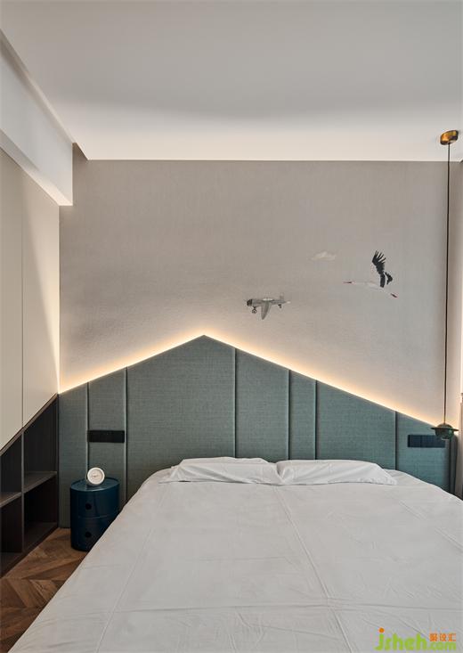 儿童房的设计充满了童趣,床的硬包不似以往的长方形,而采用了不规则的硬包,让童趣扑面而来。房间采用无主灯的设计,让灯隐藏在硬包的边沿,灵动活泼。