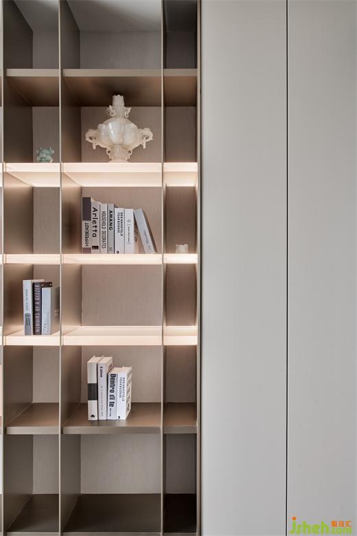书籍是知识的载体,多格的书架满足用户的不同需求。为了方便用户寻找书籍,这里就有一个贴心的小设计,书架里藏着灯带,由亚克力隔开,光照在书上,十分精巧。