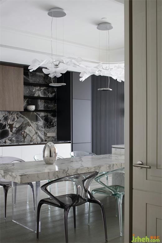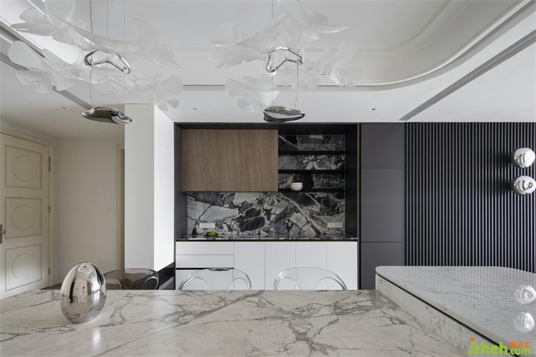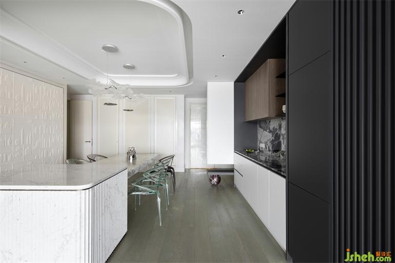 上海豪宅设计改变传统餐桌形式,岛台与餐桌的结合,同时增加西厨区域,满足餐厅多场景使用。