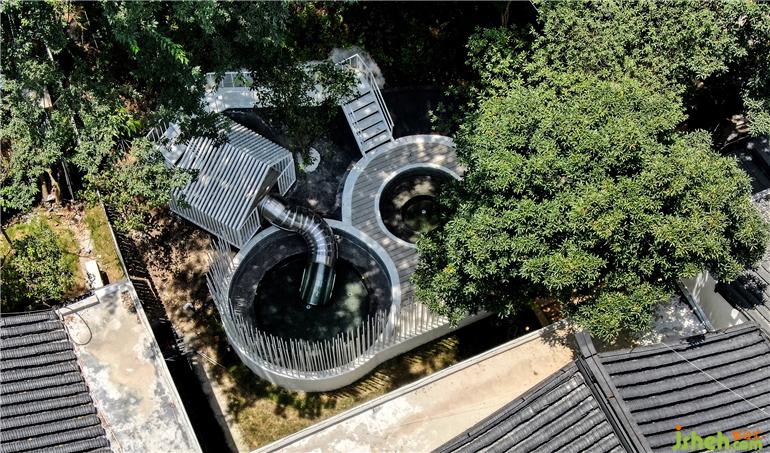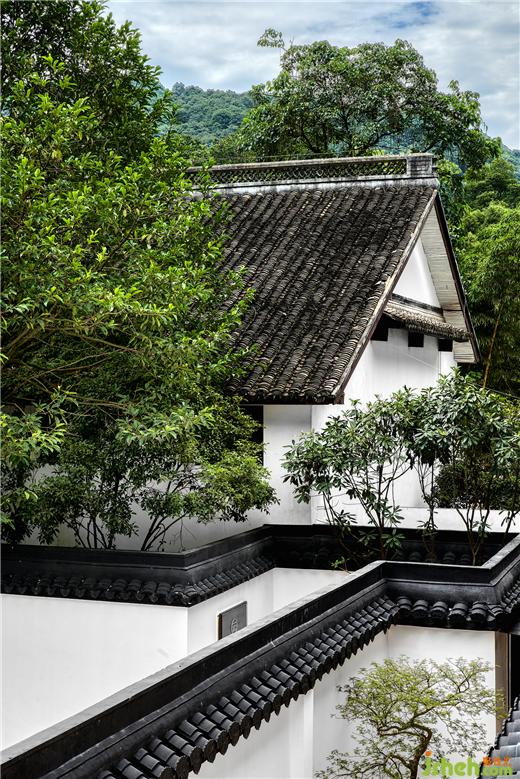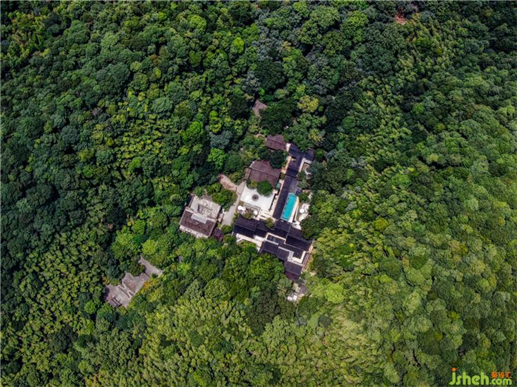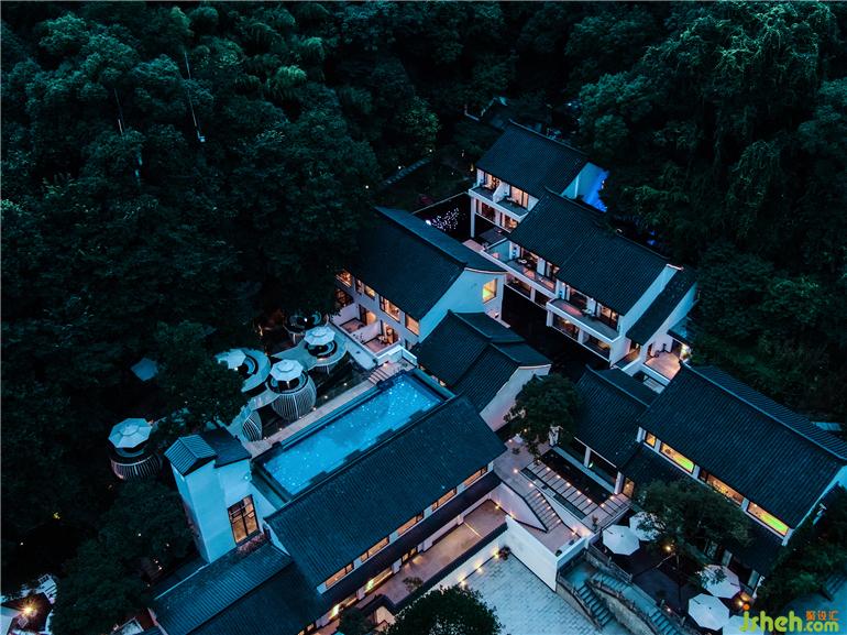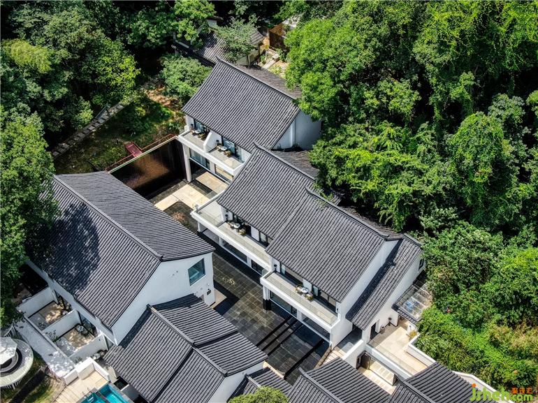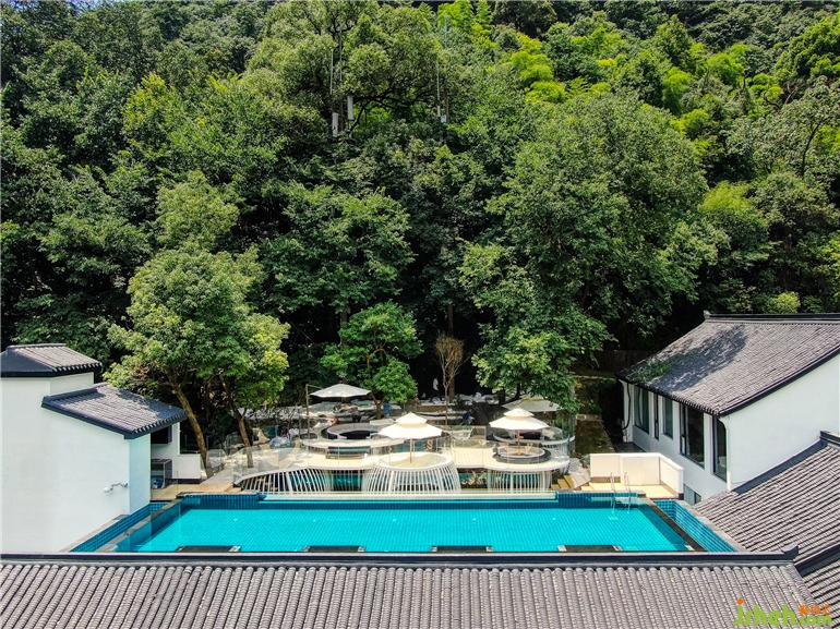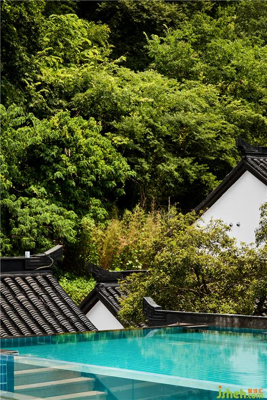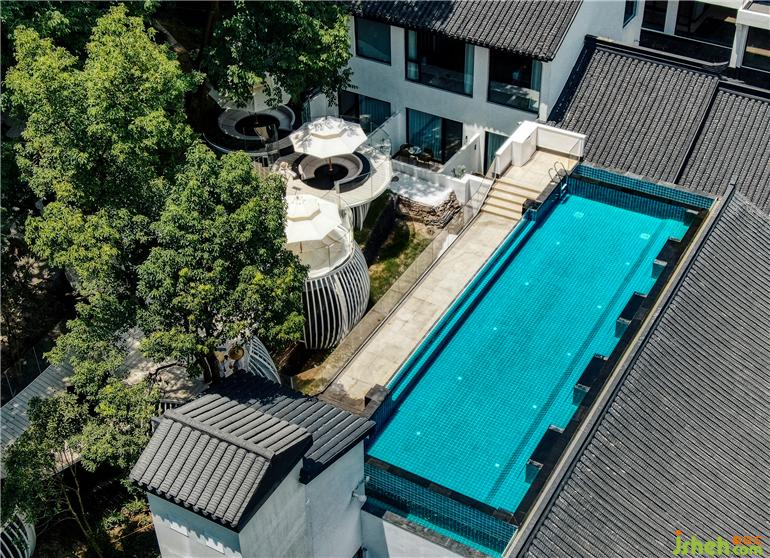 徽派建筑屋顶呈现全景观泳池,传统东方美学与新时代生活理念碰撞出奇特而美妙的火花。古韵极致,白墙黛瓦,错落有致。一汪蔚蓝色泳池与天空相呼应,掩映在漫山遍野的绿色中,是现代建筑与自然的完美交融。
