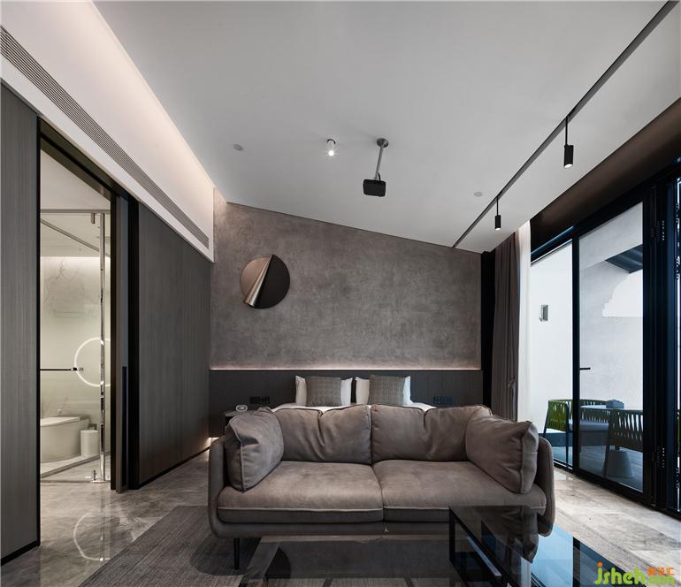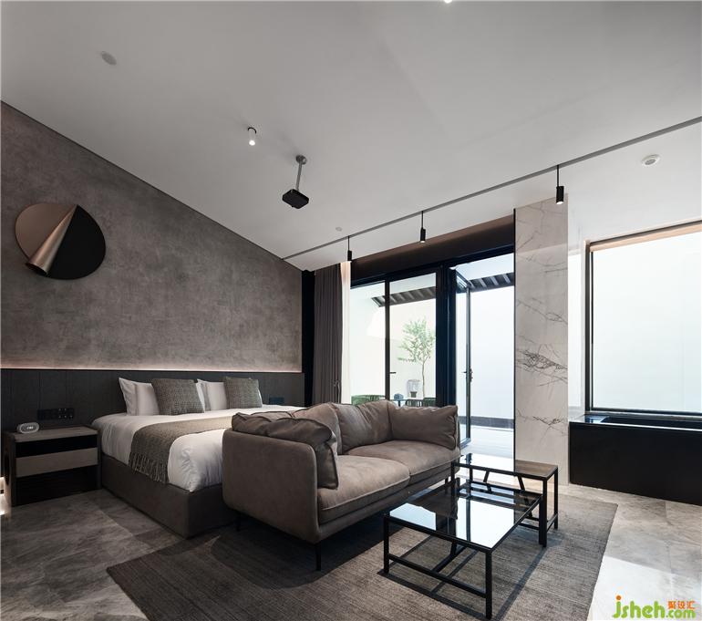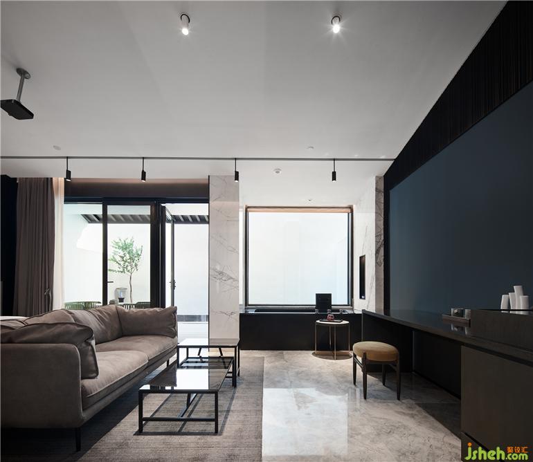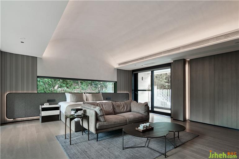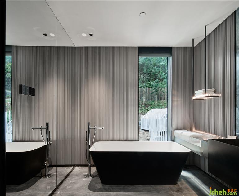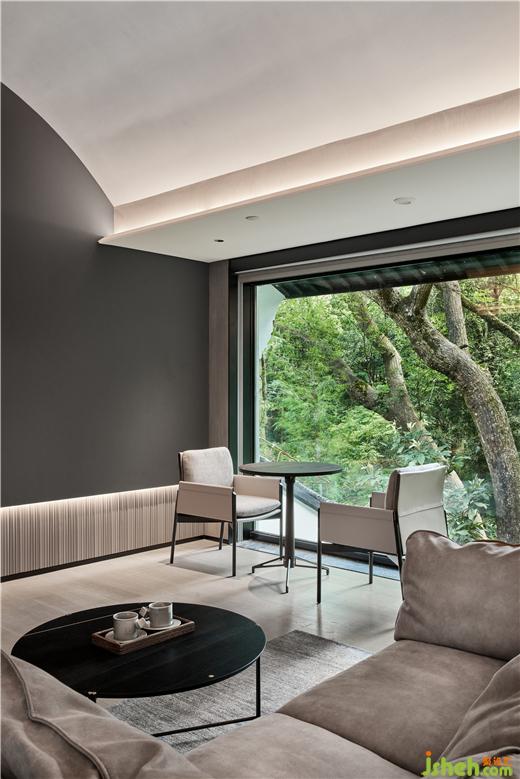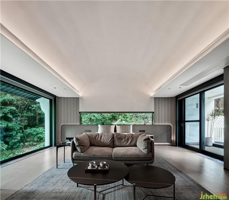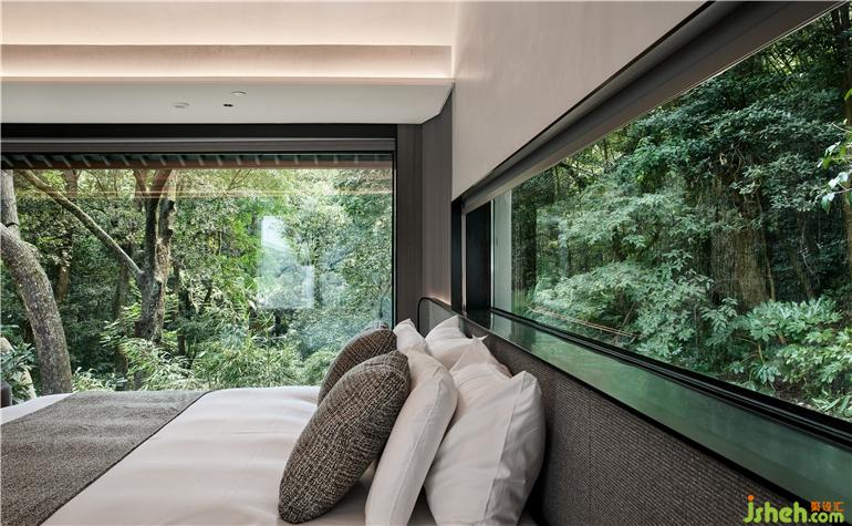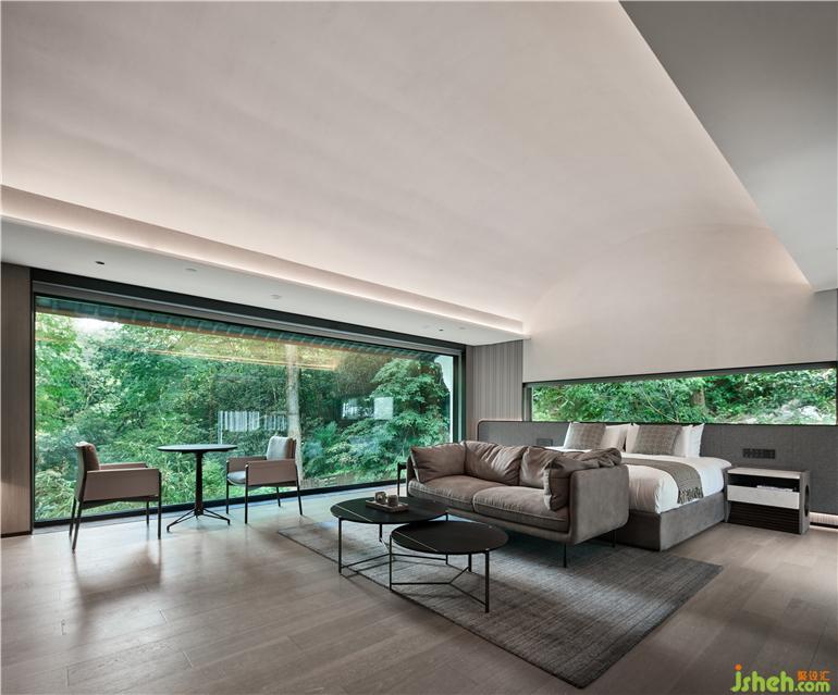 杭州度假酒店设计两面通透的落地玻璃窗,把山林绿意带来眼前。