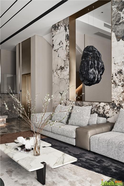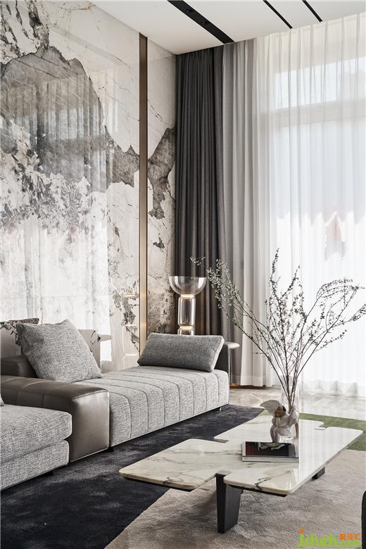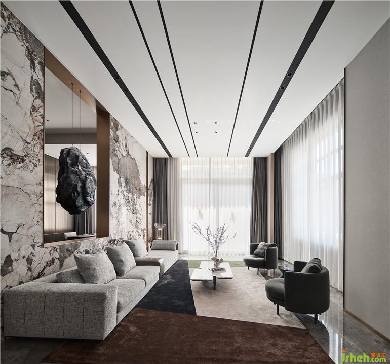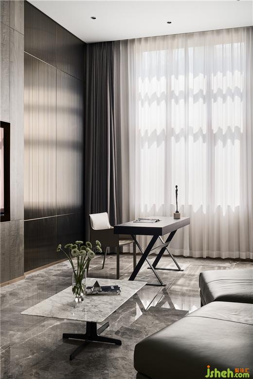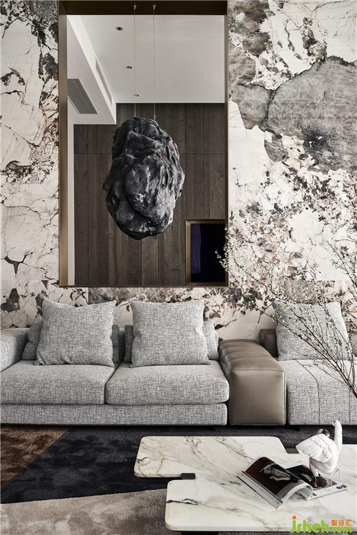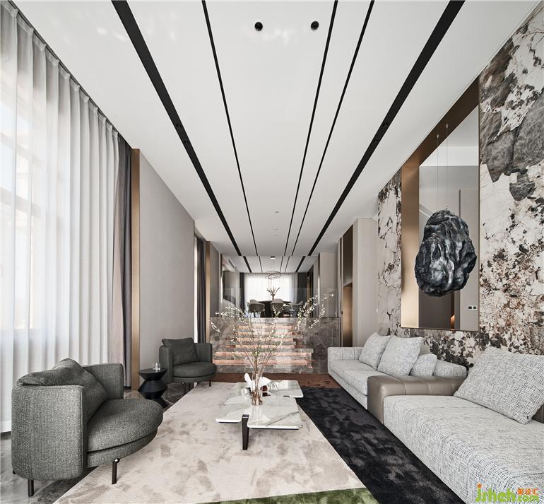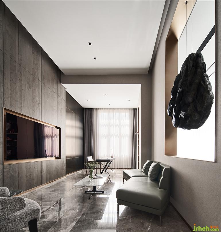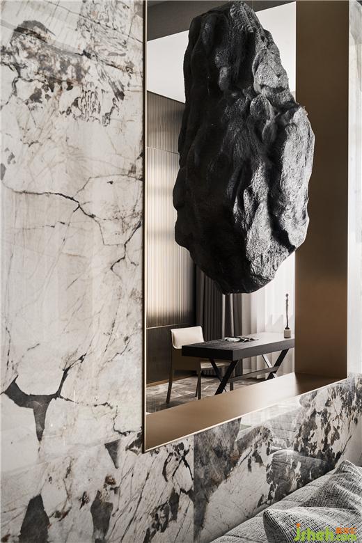 这种类似“取景”的手法创造出可对话交流的视线,呼应的金属“画框”则成为了引导视线的线索。“山石”悬吊在画框中间,杭州绿野春天别墅装饰设计形成一部分的视觉遮挡,让窗开出更大气,也更亲人的尺度。