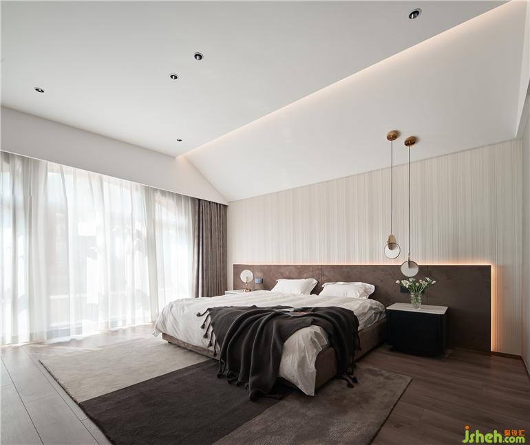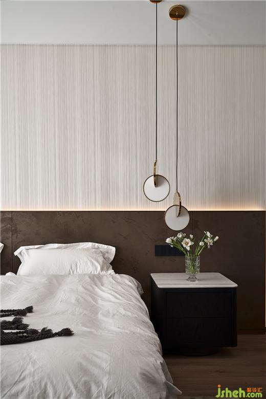 主卧自带步入式衣帽间与休闲露台,倾斜的顶面原始结构采用叠级处理,经典VESCOM壁纸独有的长条肌理为为简奢的空间营造立体感。