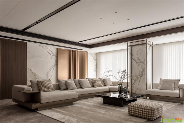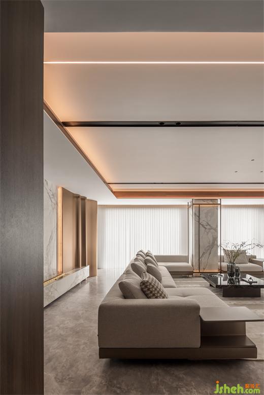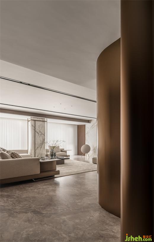 ▼ “金属波浪”的视觉引导,从玄关看客厅
