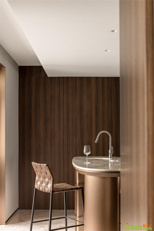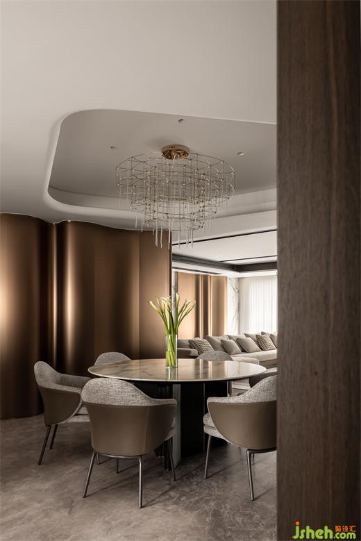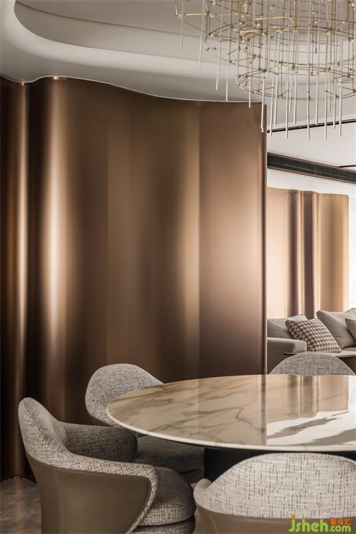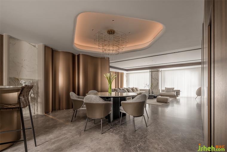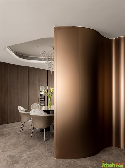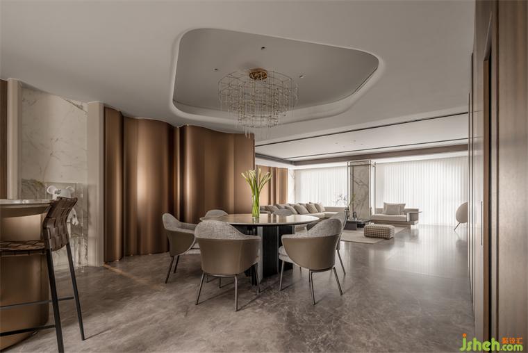 象征完满的“圆“与“弧”充分运用在玄关背后的餐厅结构。被统一木饰面隐藏的蝴蝶门承接了大量的餐边收纳,杭州大平层装修设计师还细心地将无框新风口藏进了顶部的异形吊顶,没有棱角的共聚空间让家人更多的交融在一起。