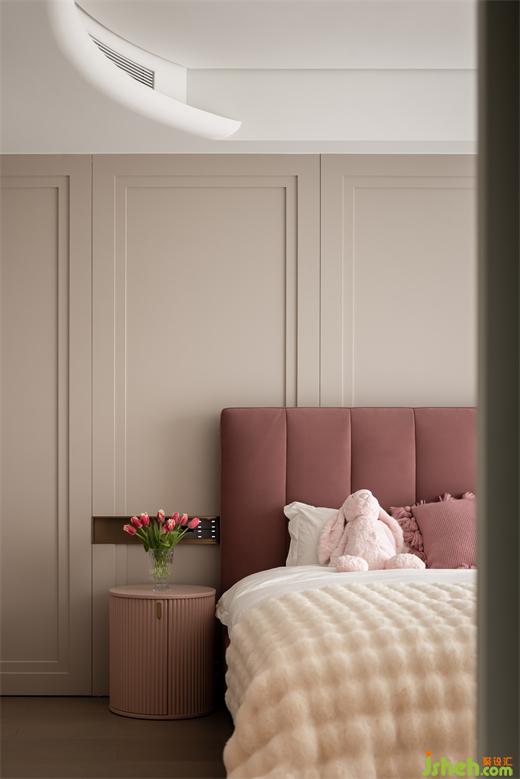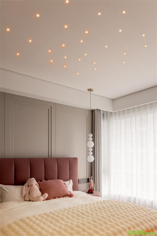 为小公主定制的梦幻套间,带有灰度的白色+粉色组合经久耐看;卧室简洁的星空顶设计也恰如其分的营造了温馨的氛围感。