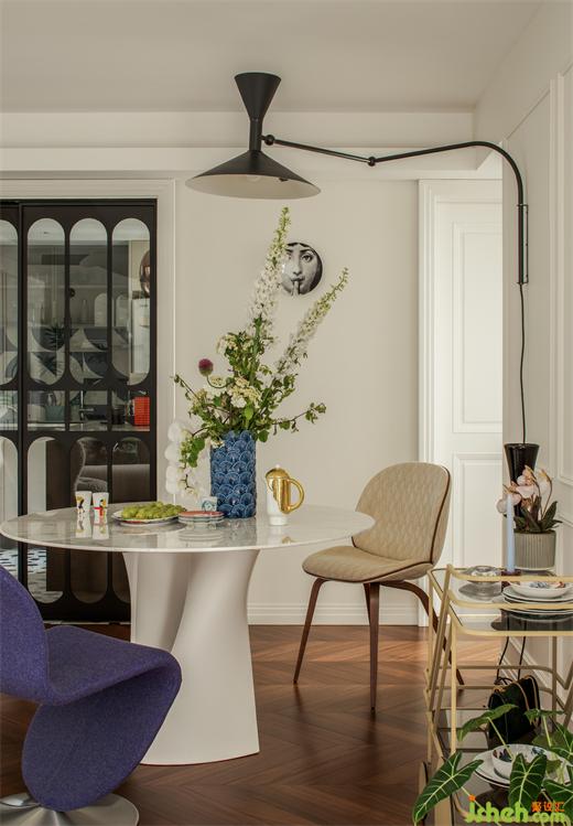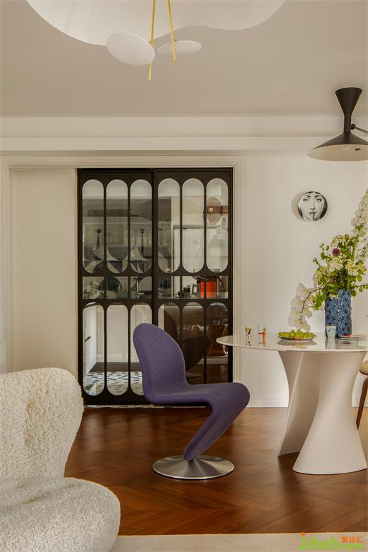 定制的移门拉开厨房的序幕。法式新家中,每一个生活的转角都经过了精心考虑。为了更好地融入整体氛围,上海公寓改造设计师亲自画稿,定制了厨房法式黑框圆弧玻璃移门,复古而优雅,开合之间不仅是门的意义,更是空间风格的点缀。