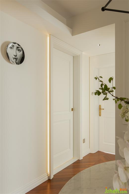 因为原始结构的局限,硬装上没有做过多装饰,墙面简单的定制线条营造着轻松的法式气息。定制门与门套在传统法式线条叠加的基础上,上海公寓改造设计摒弃了过多的弧形元素,采用直线条叠加,既符合空间柔美中又带有硬朗的气质,同时也表达了居住者的性格与处世态度。