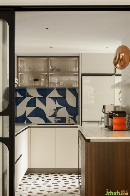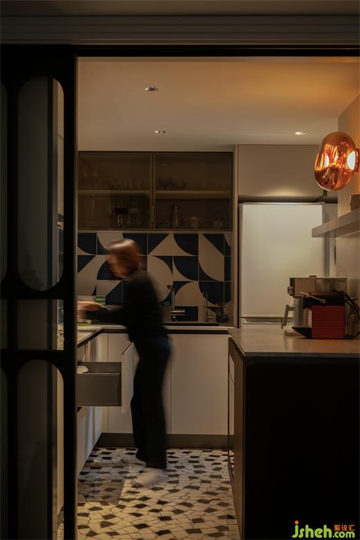 走进厨房,柜体内嵌厨电,同时保留了收藏与展示的空间。L型的操作台面干净利落,也不缺乏必要的生活仪式感。