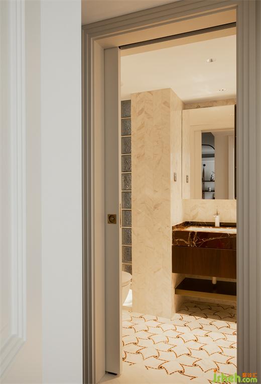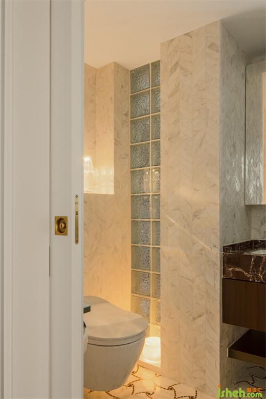 小而精的卫生间,墙面使用柳叶花砖的大理石马赛克,上海公寓改造设计整体中有细节,局部玻璃砖带来通透感。