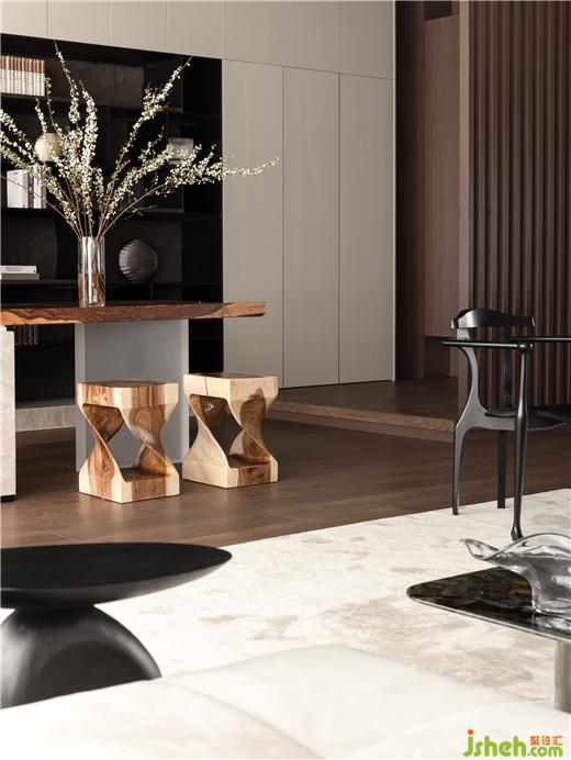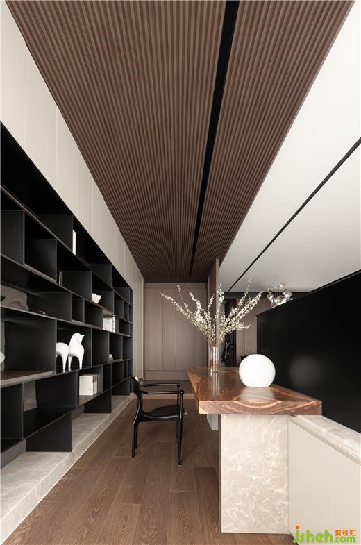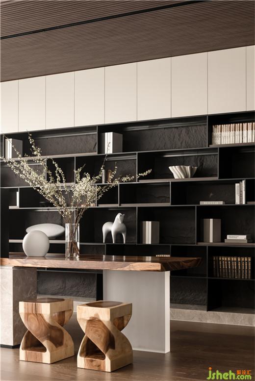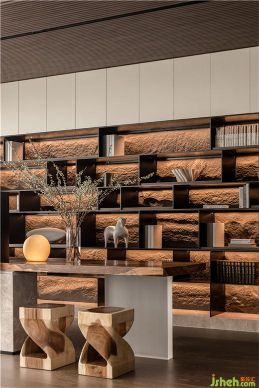 不走寻常路的客厅布置同样展示着空间“在秩序中寻找变化”的独特个性。中赢星际豪宅设计以电视+书吧为核心的动线将客厅以沙发会客 - 多功能书吧 -(未来的)亲子互动区三个功能分区环绕链接起来,创造了没有实际分隔却各有特性的生活空间。一家人的日常互动、对于大量藏书阅读的需求以及在未来迎接新生命的计划……这个家庭的一切活动都将在这里展开。
