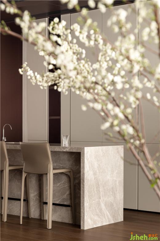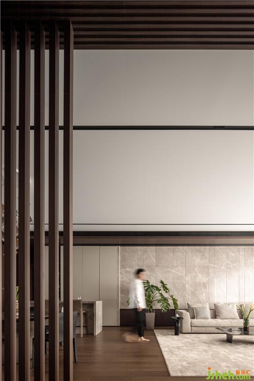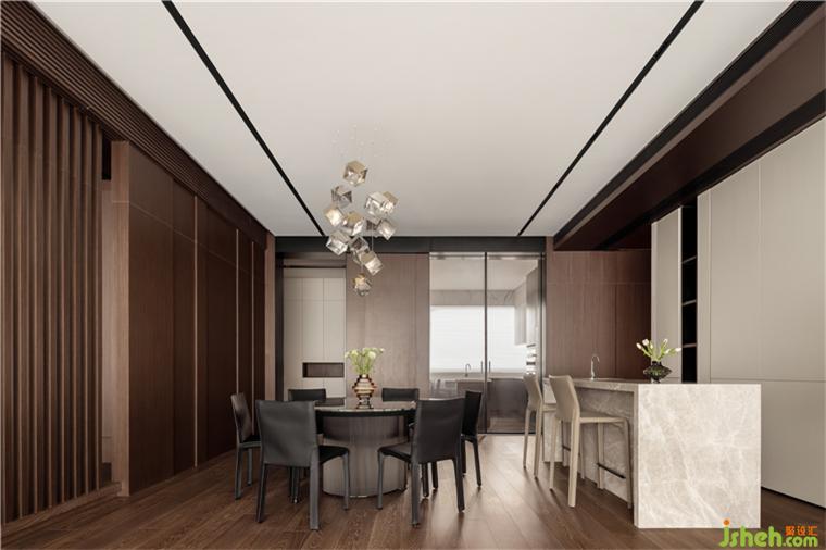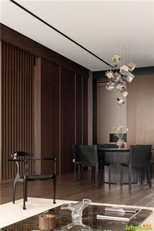 餐厅作为秩序梳理的一部分,位于玄关入口与鞋帽间的后方。沉稳的色调结合墙面充满秩序感的凹凸+镂空立面处理,显得安静而有力量。