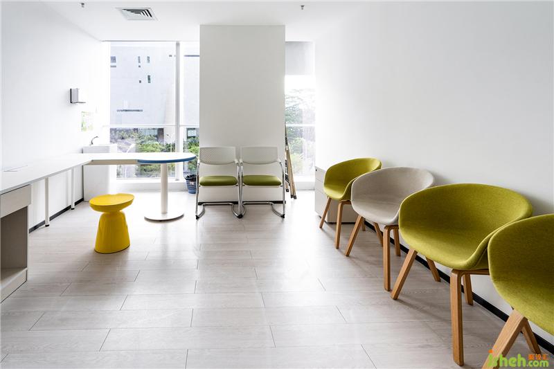 医生诊室壁纸与大厅相呼应,椅子、桌子色彩鲜艳明亮,很温暖、很放松。
