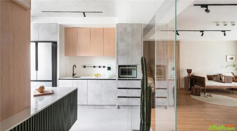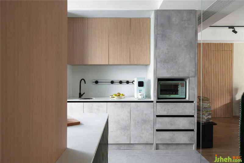 中西厨采用中岛“回”字形动线设计,让彼此更好的连接在了一起。莫兰迪绿、白色与原木色木作的组合点亮空间,融合平织地毯,不多不少,恰到好处,整个空间流露出自然与原始之美,仿佛置身于自然的怀抱。
