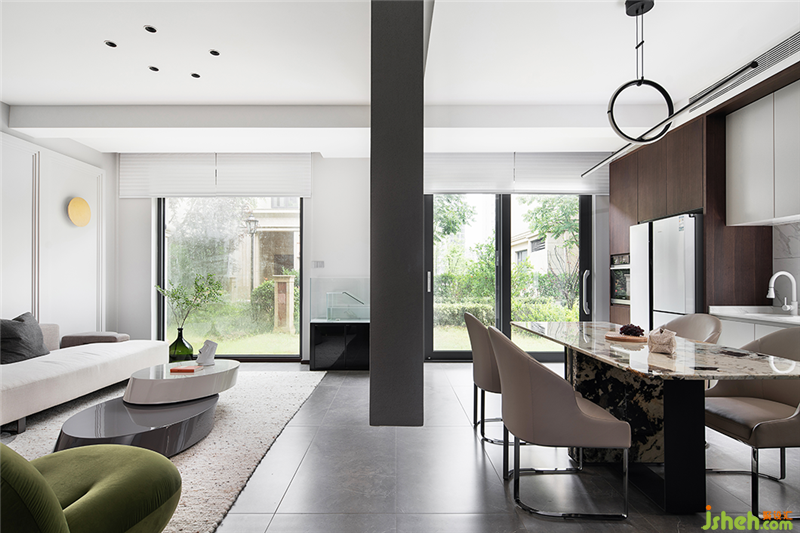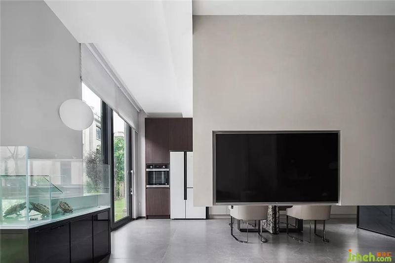 我们悬浮客厅背景,串联客餐轴线,让室内行径自由流动两侧平面舟山别墅装,搭配阳光的倾洒,围绕中心背景铺展开来,十分具有空间节奏感。