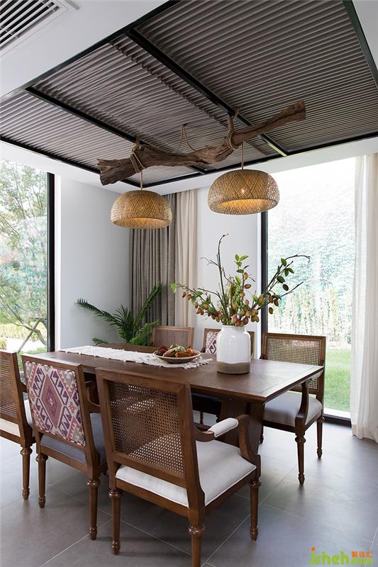 餐厅采用返璞归真的风格,采用仿真枯木元素与编织元素营造田园山野的轻松氛围。但实木家具与精致的图案又将奢美巧妙的结合起来。
