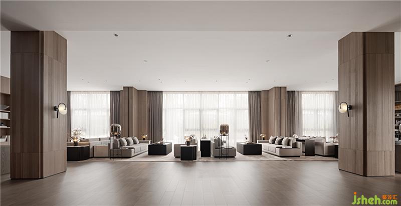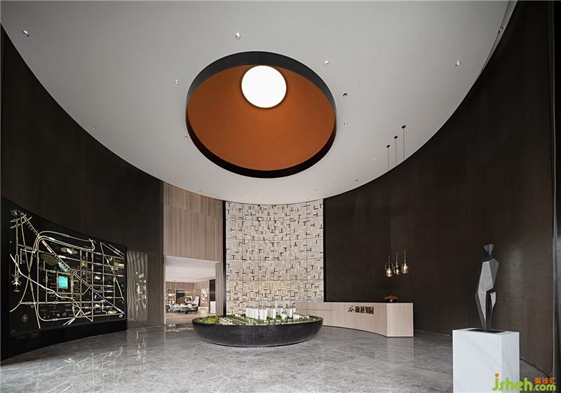 从远处看,沙盘区顶部是一个巨大的圆形,浅灰色的天花与深灰墙壁相互照应,像是一个巨大的铅球,给人予沉重质感。设计师在视觉的终点设置了一面纸质屏风,由层层切开的纸张做成箱体,纸层次会根据色彩及自然的生态做排列,在细节上看,高高低低的切割工艺,体现出最自然的艺术感。装修公司