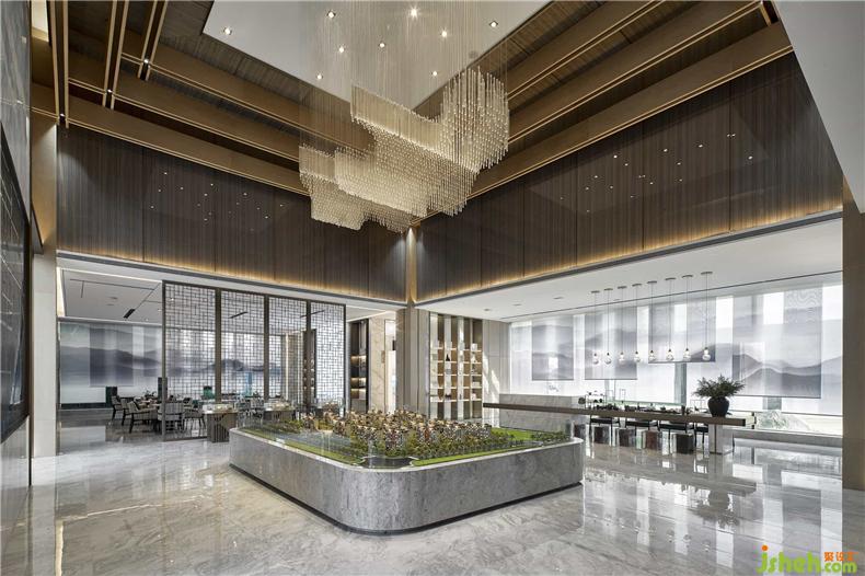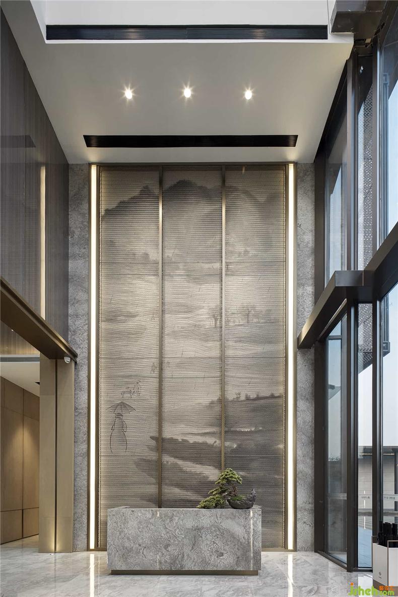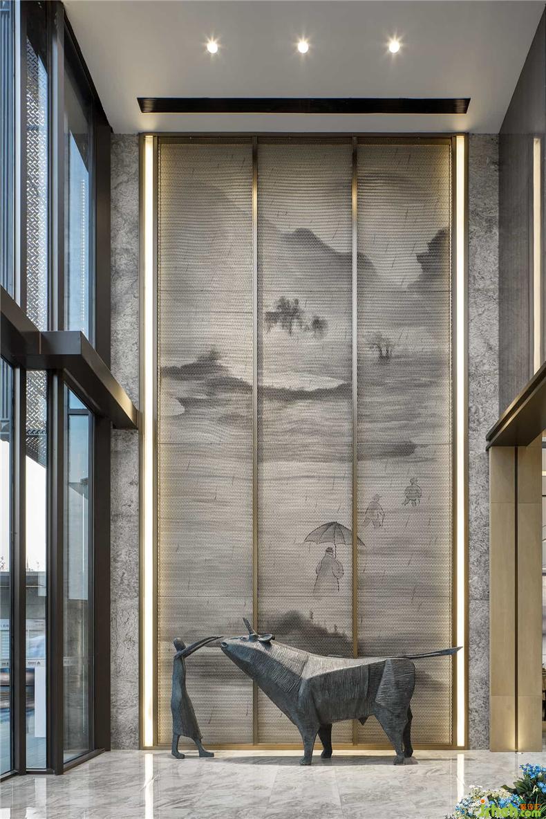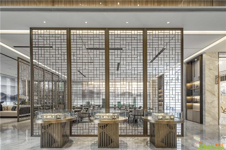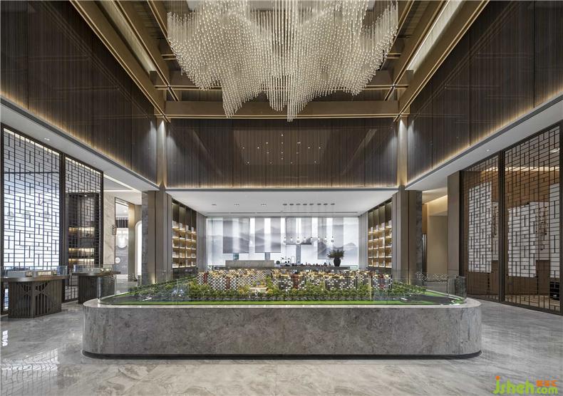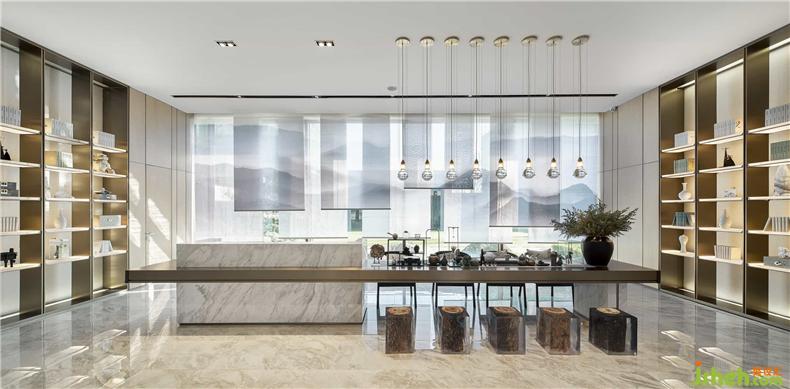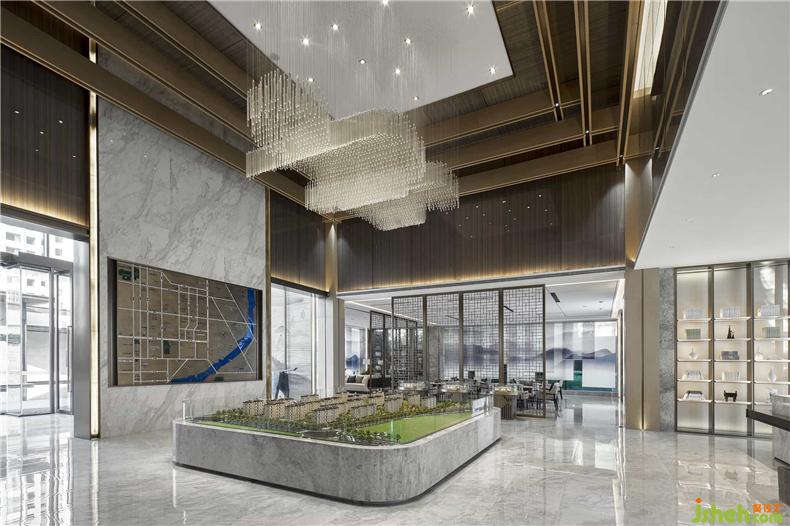 沙盘区顶部的玻璃纹理使得空间变得饱满而不压抑,宛如屋檐,又似“天井”,更像高山中缥缈轻盈的白云,置身天地,当得“一览众山小。”又像绵延宛转的江海河流,为所经所至之地带去贯恒千年万年的福泽。房屋瓦舍,从古至今是人类“家”文明的重要承载物。在这样的气势下,居住者的心境与环境相影响,也都会变得宽阔宏伟。