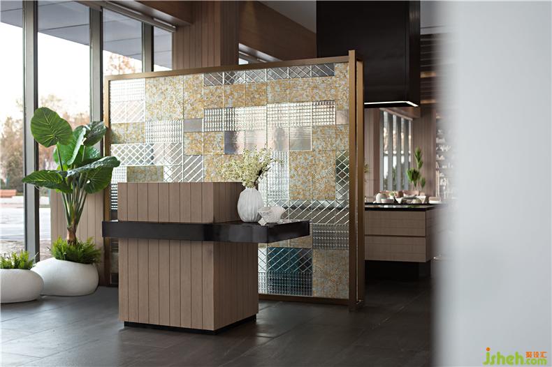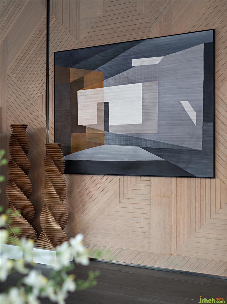 作为一个海边城市,青岛最大的特色便是辽阔的海岸线,徐徐海风吹动葱绿的树叶,在阳光下发出沙沙的响声,白色海浪拍打黑色的礁石,金黄的沙滩印出一层又一层的线条。沙盘区的壁画将这些具体事物抽象化,室内设计师将自然元素以现代艺术的形式展现出来。