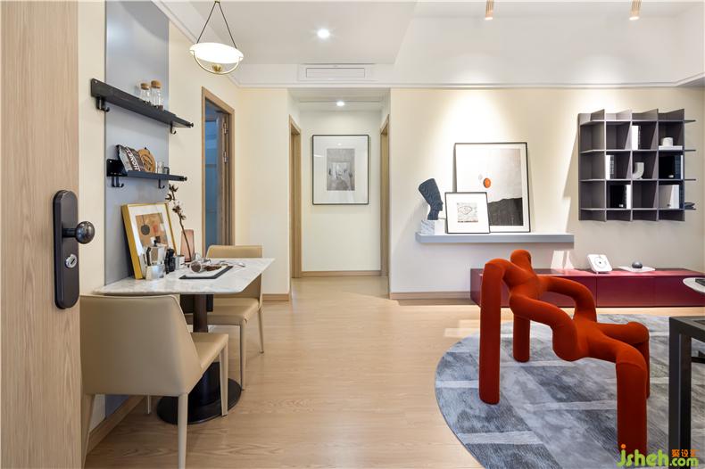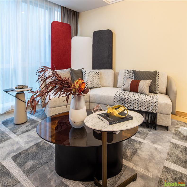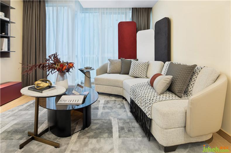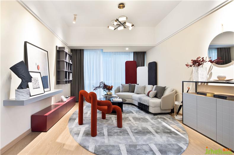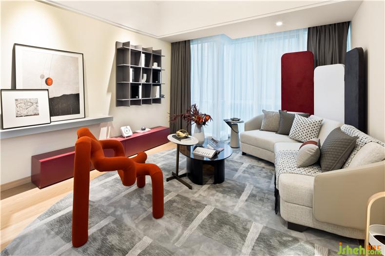 客厅采用的米白色的主色调,配以木质地板与拼接图案的地毯,在现代风格中又添加极具北欧特色的家居、点缀以大气的经典中国红,将中式与法式完美地融入进现代风格中。室内设计师