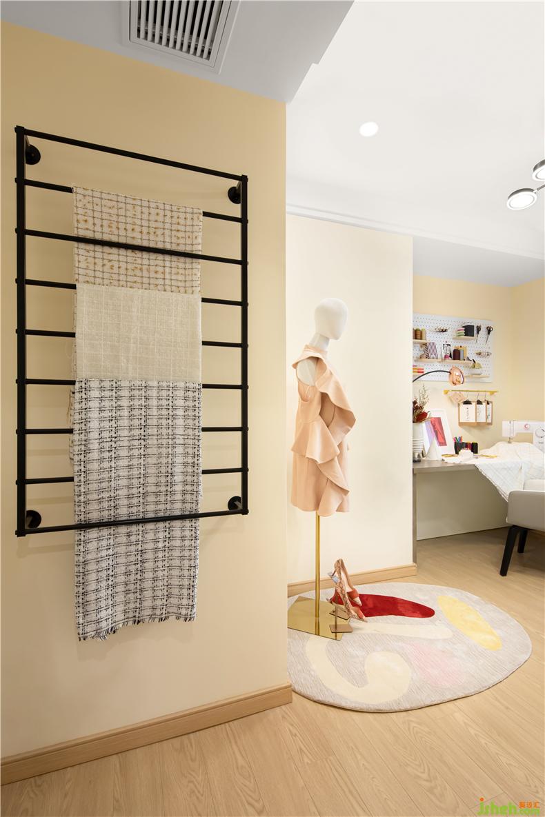 手作室作为女主人日常办公的场所,L字形的书桌增大了工作范围,整齐的码放着纱线剪刀工具。室内设计师