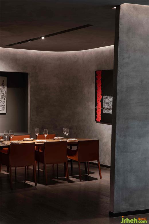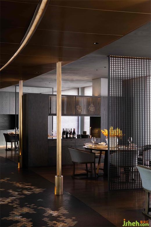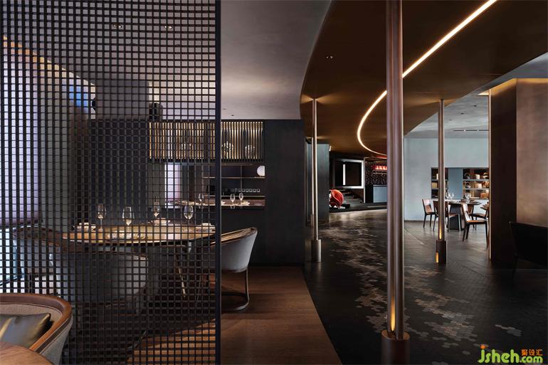 中央吧台区,北京餐厅设计师用玻璃砖和艺术肌理漆纵横阡陌,特殊材料所带出强烈的风格特色,粗砺与精致交错,为空间的赋予丰富的可能性。