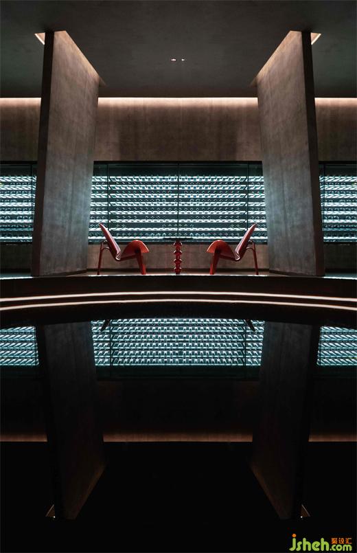 白天在自然光下两种材质呈现虚实之趣,晚间,中央吧台琉璃砖由内浸润出温暖静谧的光。