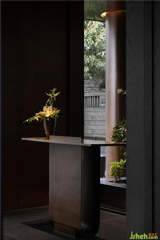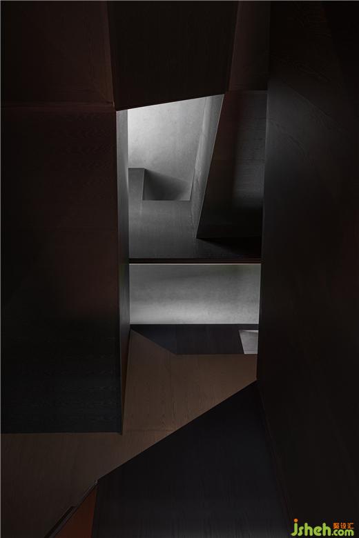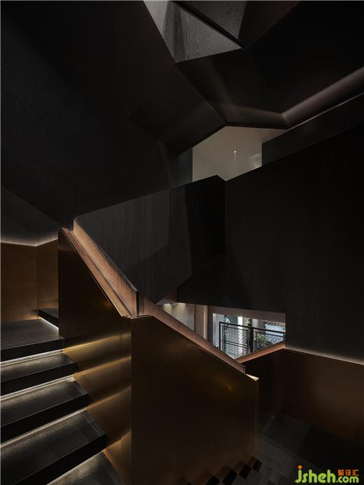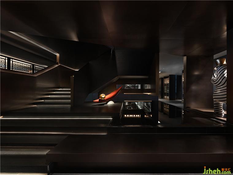 较为深沉的页岩板吸收空间中餐厅漫反射的余光,以烛光的方式照亮用餐区域,在视觉上削弱了人们对于下层空间的关注,使目光聚焦在菜品本身,让空间拥有一种无限延伸的视觉效果。