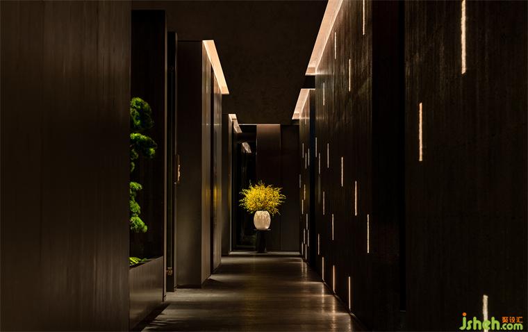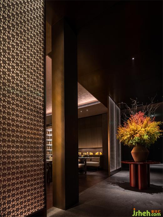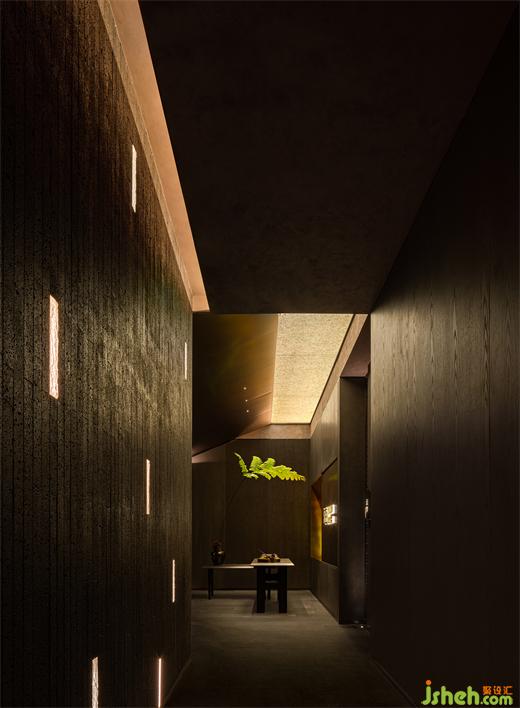 部分玻璃幕墙,用黄铜金属板进行”折叠“塑造出一个退让的、非直面式的门头,勾画出一处理性且大胆空间入口,黄铜金属板与玻璃幕墙形成强烈的视觉反差,墙面的线性灯带照亮黄铜金属板的丰富纹理的同时,引导人们往空间深处走去。