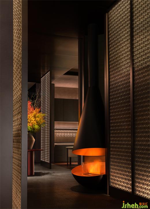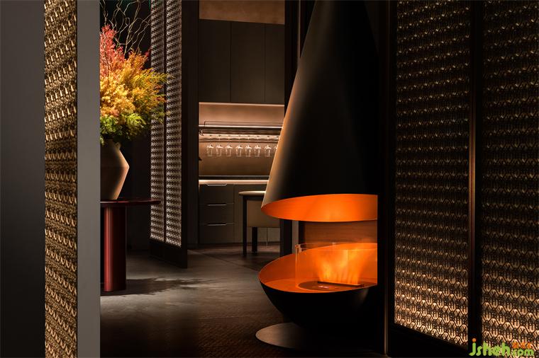 穿过门厅,经由片墙引导,进入空间内部。首先看到的是极具艺术感的悬挂式壁炉,独特造型的壁炉仿佛是一件雕塑作品,成为了空间的视觉重点,并营造出一种愉悦、轻松、温暖的空间氛围。