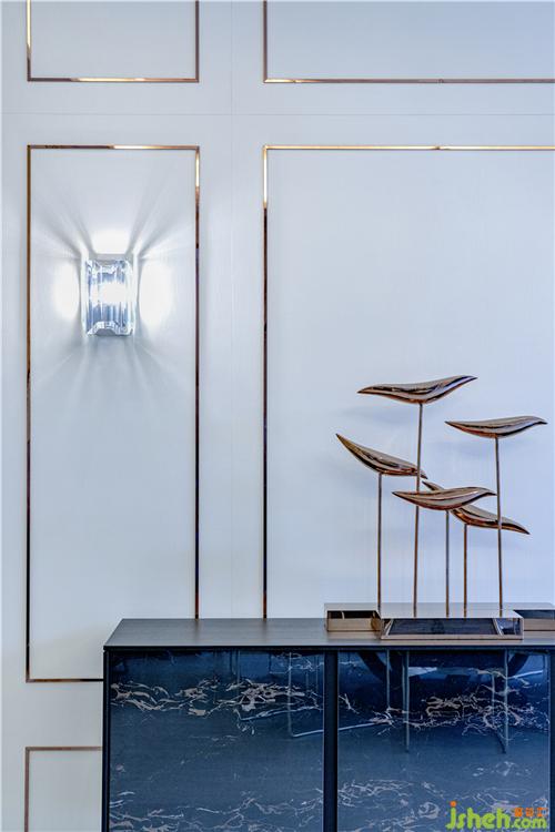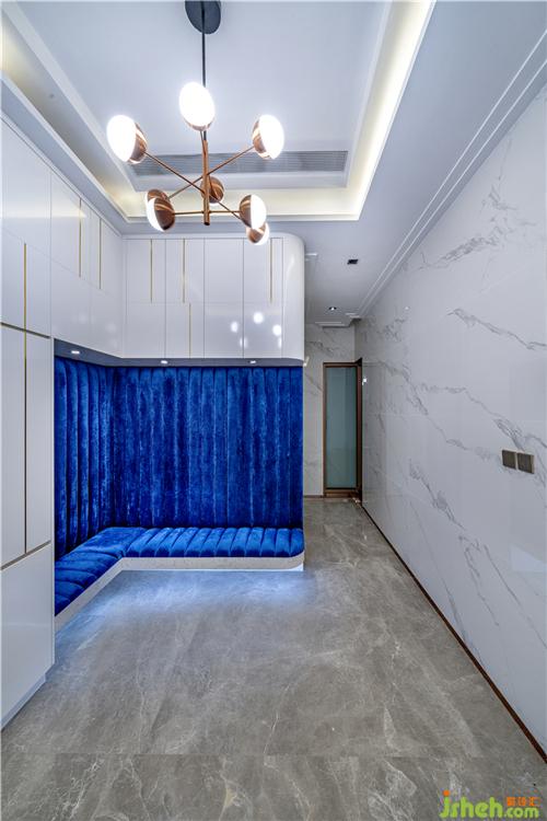 玄关层主要以出入为主,入墙大柜为户主带来足够的储鞋空间,蓝色绒布座椅为贯彻主题,带出优雅奢华感觉。现代别墅装饰