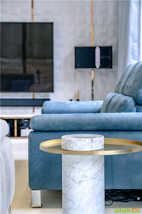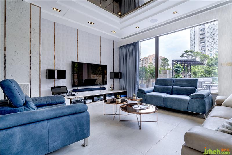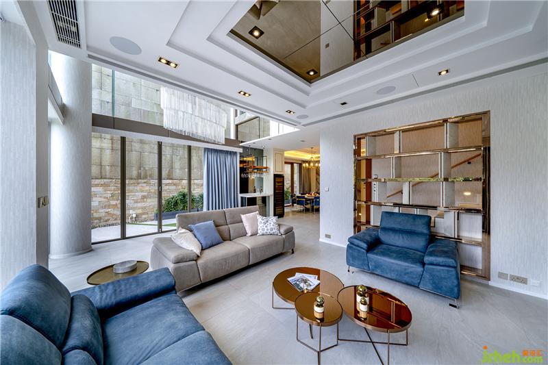 客厅设计以白、灰、蓝为主,设计师将不同的材质交错运用,风格色调成熟沉稳。摆饰架与墙身融为一体,为旁边的楼梯多透一点光。通向花园的门采用大块落地玻璃设计,除了采亮度和空间感极好之余,亦尽显水晶吊灯的气派,庄重优雅中突出时尚细节。