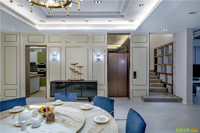 饭厅的云石元素较多,其中以云石特色墙最为瞩目,设计师以饰柜和餐桌呼应,与客厅清楚分开两个空间,却又以灰蓝色餐椅与客厅沙发互相影衬,保持设计整体连贯性,细节花尽心思带出含蓄的美。现代别墅装饰