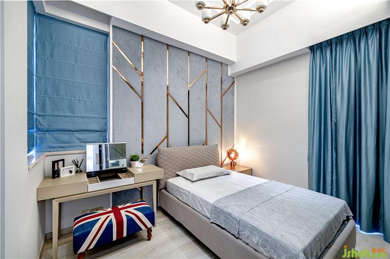二楼的两个房间用上截然不同的色调,姐姐的房间采用型格的灰蓝色作主调,床头有树形金属花线,配搭简单的装潢,成熟有品味。现代别墅装饰