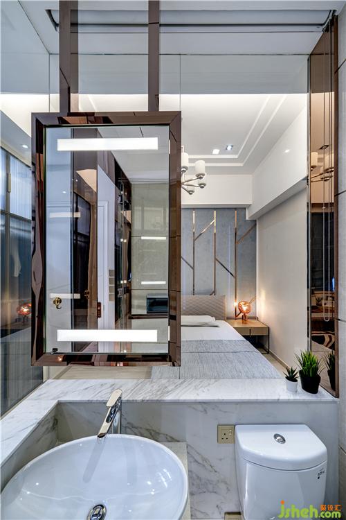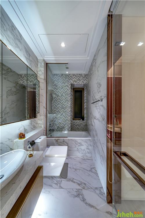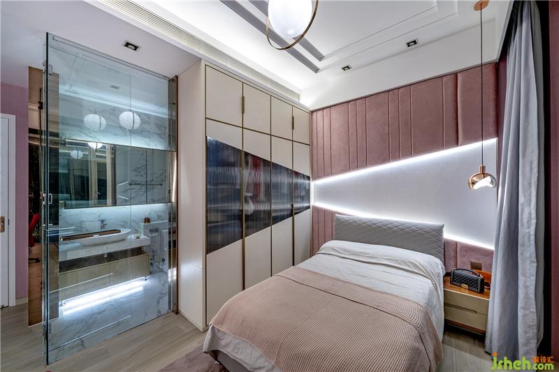 妹妹的房间则以粉红色和白色为主题色,衣柜和床背的墙身有几何线条连接,可爱之余增加设计感。两个房间均用大量云石元素打造套厕。