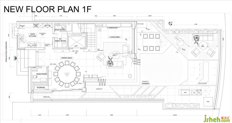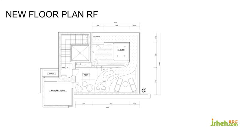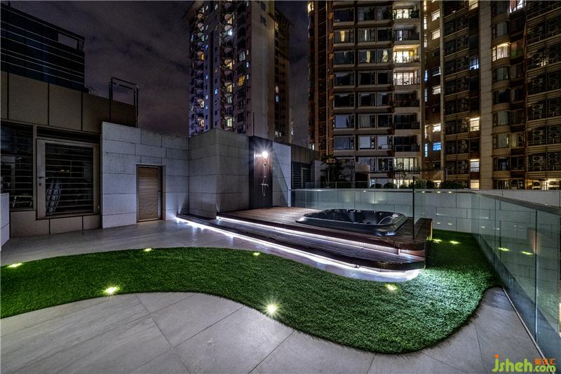 于主人房外的楼梯拾级而上到达天台,设计师为维持整个家的一体感,天台用色和花园十分相似,一样以石地板配搭绿草和木地台。不同的是,为响应天台按摩浴池的主题,设计师将草地铺盖成流线形,悠闲有特色。